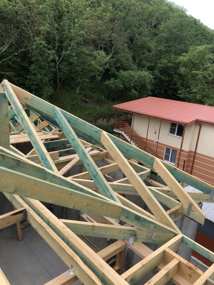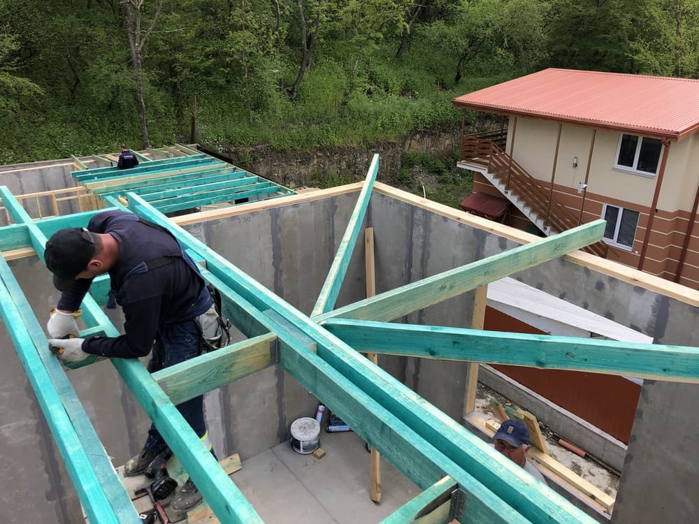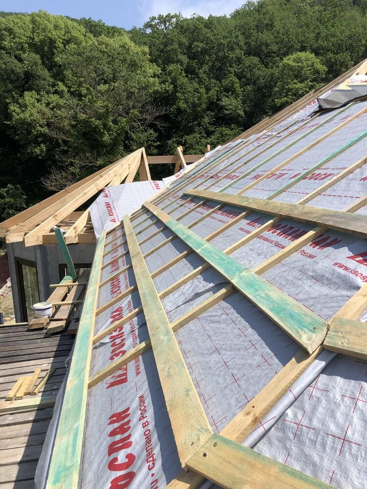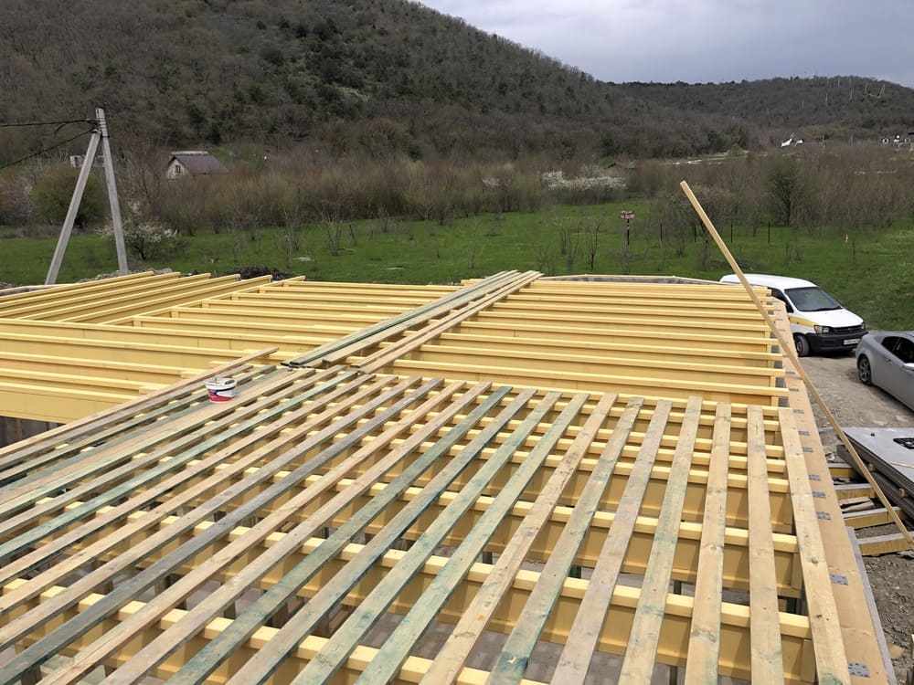 Кровля может быть построена из бруса 150х50мм или SIP панелей. В качестве кровельного материала можно использовать: металлочерепицу, битумную и керамическую черепицу. Также производим кровельные шовные сэндвич-панели.