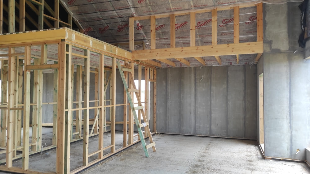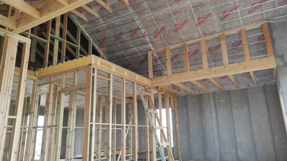 В межэтажных перекрытиях в качестве несущих лаг мы применяем двутавровые балки собственного производства с влагостойкой 24 мм. фанерой в сердечнике.