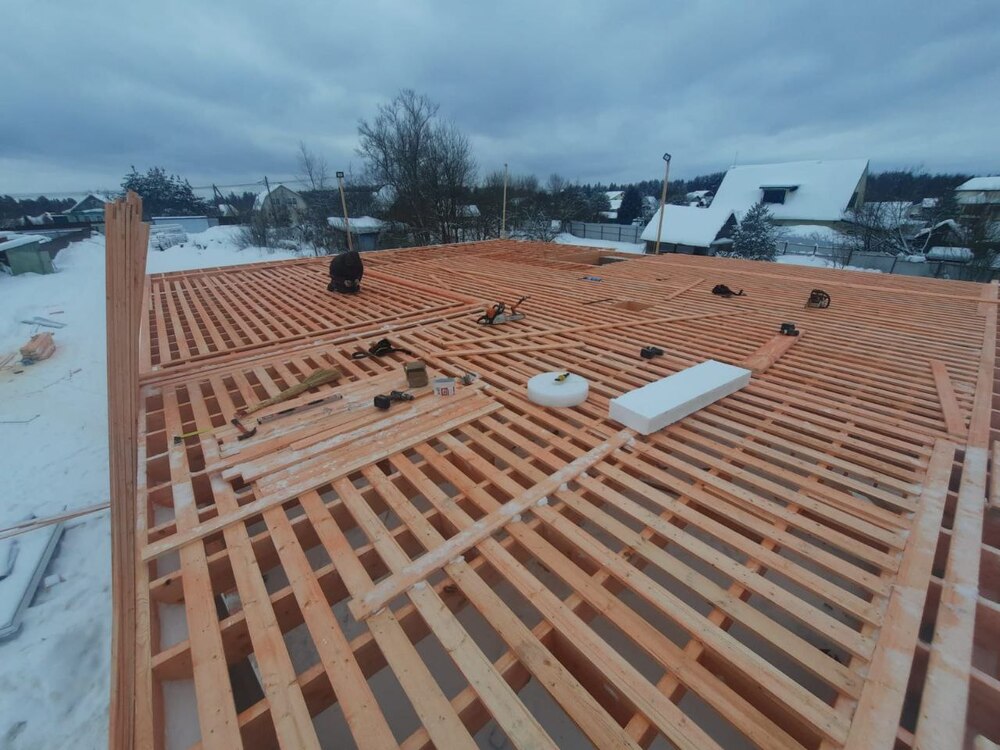 Кровля может быть построена из бруса 150х50мм или SIP панелей. В качестве кровельного материала можно использовать: металлочерепицу, битумную и керамическую черепицу. Также производим кровельные шовные сэндвич-панели.