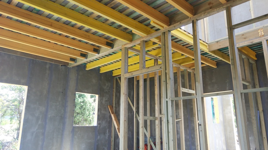 В межэтажных перекрытиях в качестве несущих лаг мы применяем двутавровые балки собственного производства с влагостойкой 24 мм. фанерой в сердечнике.