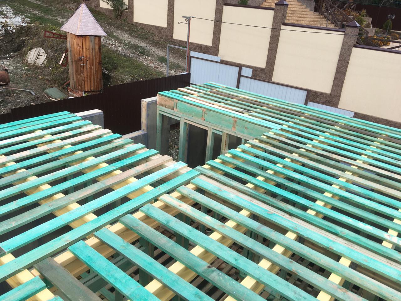 Кровля может быть построена из бруса 150х50мм или SIP панелей. В качестве кровельного материала можно использовать: металлочерепицу, битумную и керамическую черепицу. Также производим кровельные шовные сэндвич-панели.