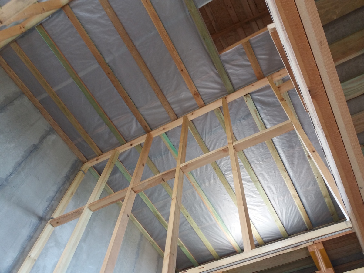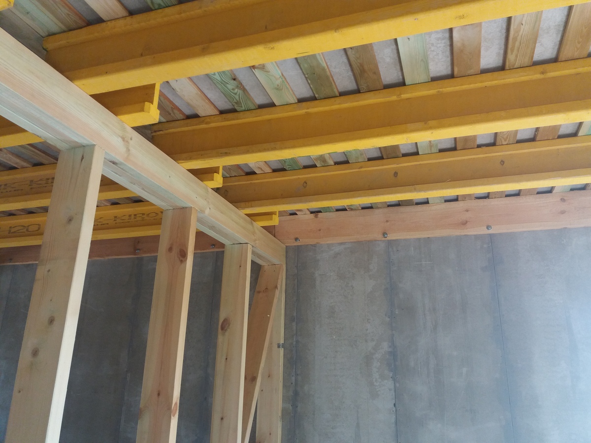 из СИП панелей из ЦСП размером 2700*1200*168 мм с антисептированным калиброванным пиломатериалом камерной сушки (46*140 мм). Монтаж каркасов несущих перегородок из пиломатериала 38*89 мм (76*89 мм).