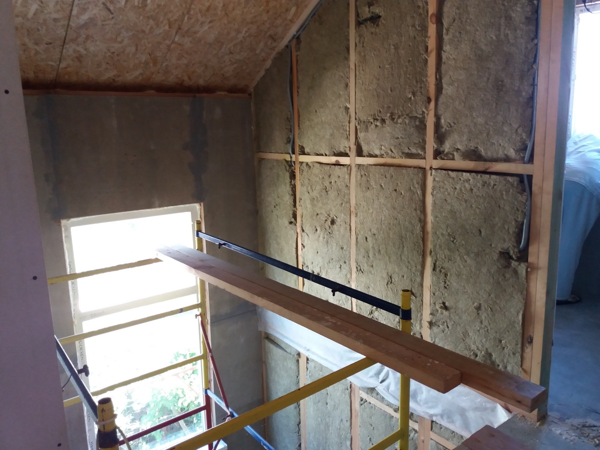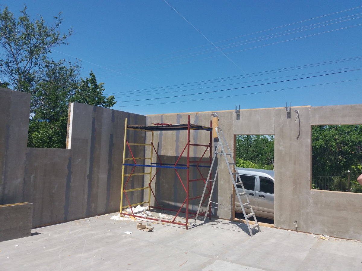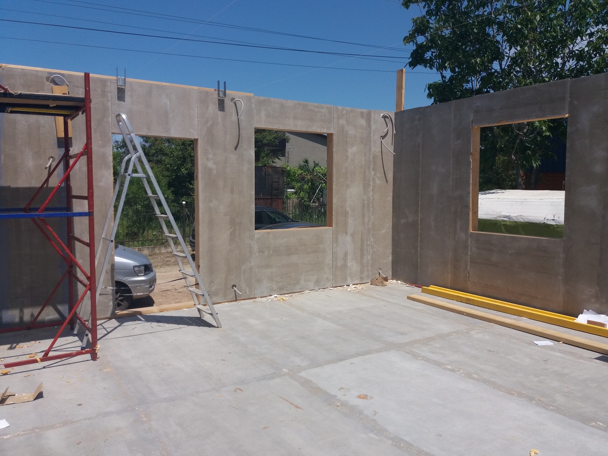 из СИП панелей из ЦСП размером 2700*1200*168 мм с антисептированным калиброванным пиломатериалом камерной сушки (46*140 мм). Монтаж каркасов несущих перегородок из пиломатериала 38*89 мм (76*89 мм).