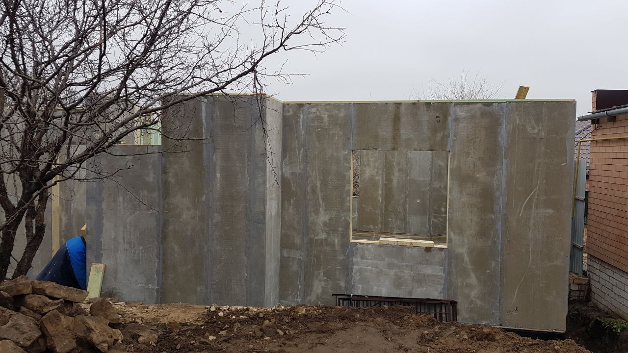из СИП панелей из ЦСП размером 2700*1200*168 мм с антисептированным калиброванным пиломатериалом камерной сушки (46*140 мм). Монтаж каркасов несущих перегородок из пиломатериала 38*89 мм (76*89 мм).