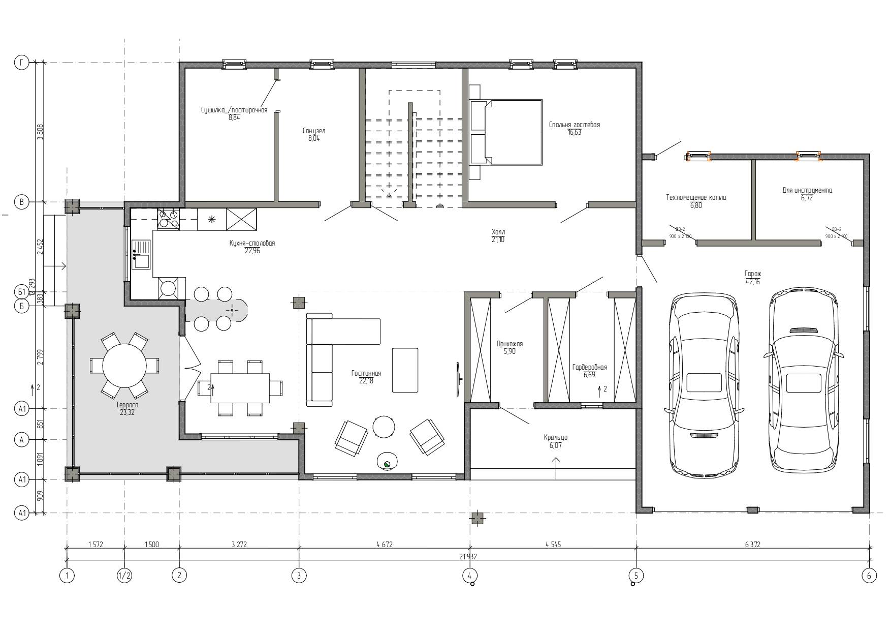 • Внутренние перегородки-каркас из сухой строганной доски: несущие 46х145 мм. Сборка в стоимость не входит