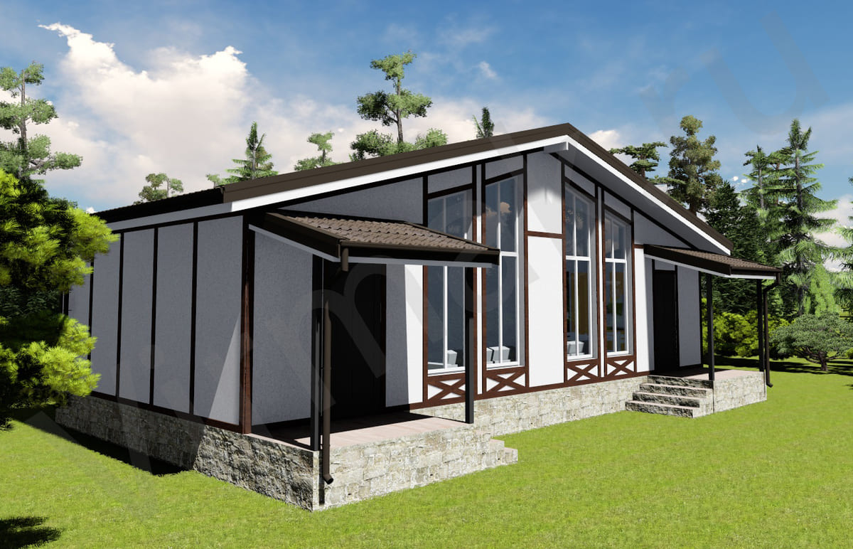 • Плоская или скатная утепленная кровля (пароизоляционная пленка, утеплитель вата на основе стекловолокна или базальта, гидро-ветрозащитная мембрана) с покрытием из металлочерепицы, полимерной мембраны или гибкой черепицы. (цена отличается от выбранного типа) (Ширина карнизного свеса от 30 см. Водосточная система в стоимость не входит