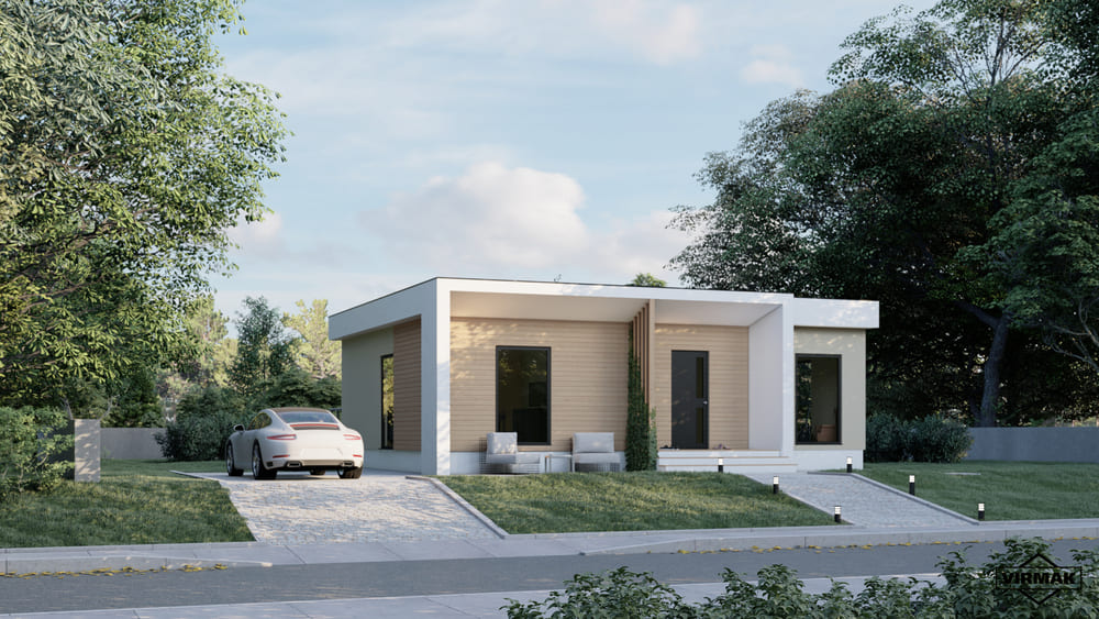 • Плоская или скатная утепленная кровля (пароизоляционная пленка, утеплитель вата на основе стекловолокна или базальта, гидро-ветрозащитная мембрана) с покрытием из металлочерепицы, полимерной мембраны или гибкой черепицы. (цена отличается от выбранного типа) (Ширина карнизного свеса от 30 см. Водосточная система в стоимость не входит