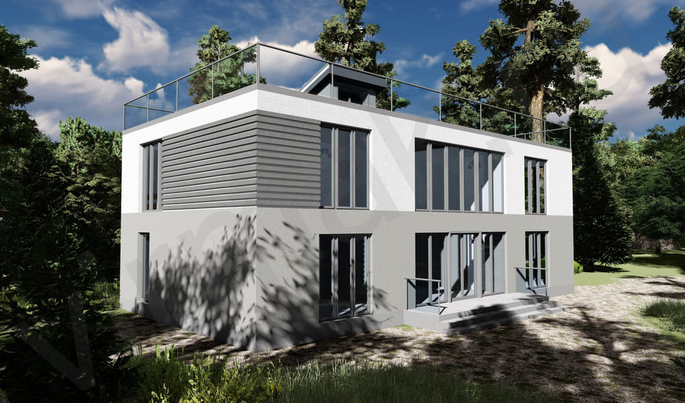 • Плоская или скатная утепленная кровля (пароизоляционная пленка, утеплитель вата на основе стекловолокна или базальта, гидро-ветрозащитная мембрана) с покрытием из металлочерепицы, полимерной мембраны или гибкой черепицы. (цена отличается от выбранного типа) (Ширина карнизного свеса от 30 см. Водосточная система в стоимость не входит